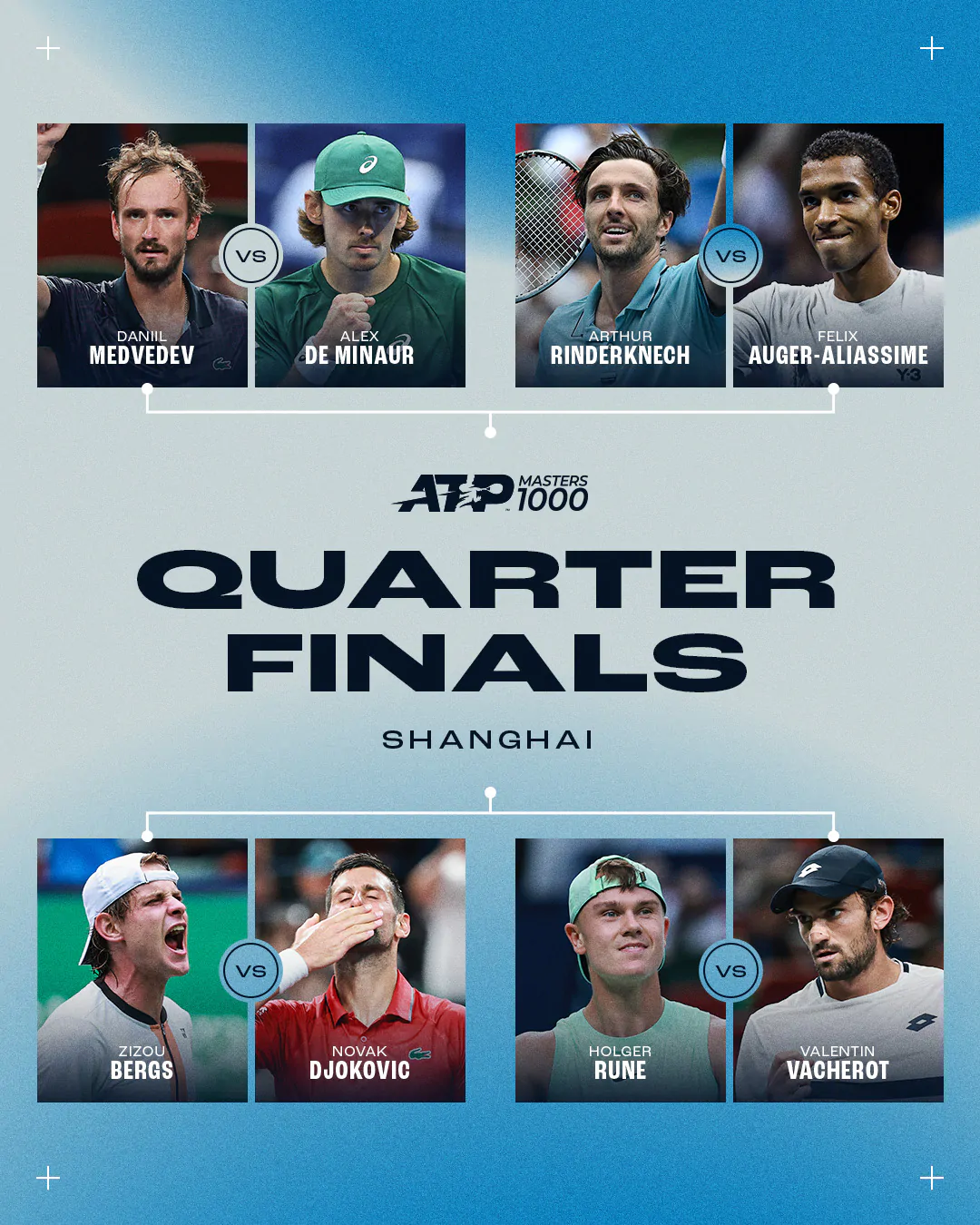 Na outra partida das quartas, o francês Arthur Rinderknech, que venceu o tcheco Jiri Lehecka por 2 sets a 0, irá enfrentar o canadensa Felix Auger-Aliassime, que bateu o italiano Lorenzo Musetti por 2 sets a 0.