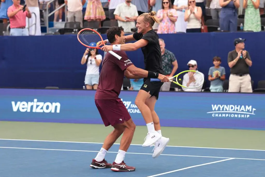 Rafa Matos comemorou a conquista do título do ATP 250 de Winston-Salem, nos Estados Unidos. Neste sábado, ele e Marcelo Melo viraram a final contra o austríaco Lucas Miedler e o português Francisco Cabral por 2 set a 1, com parciais de 4-6, 6-4 e 10-8, após 1h33min.