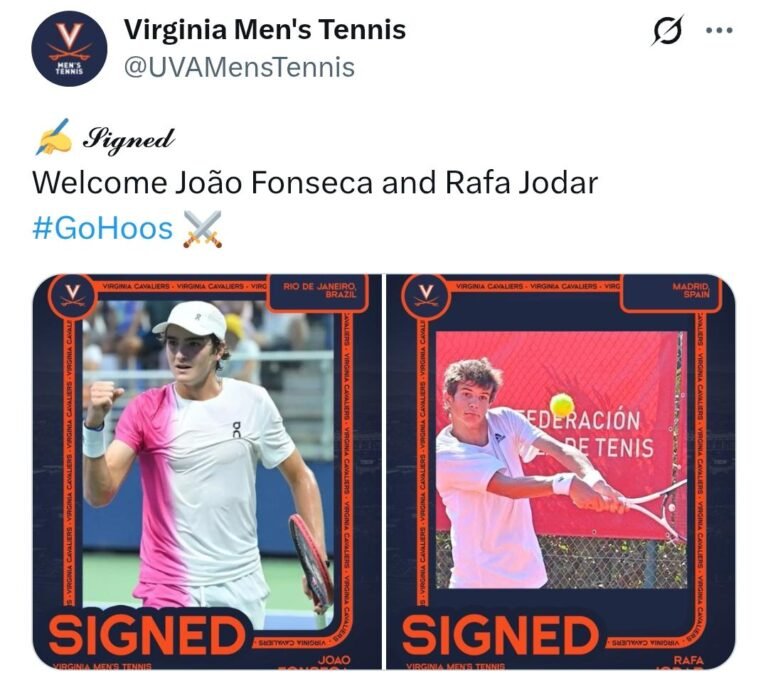 Rivais neste domingo na terceira rodada do Masters 1000 de Madri, João Fonseca e Rafael Jodar quase foram companheiros de equipe no College, dos Estados Unidos. Os dois foram anunciados pela Universidade da Virginia no mesmo dia, em novembro de 2023. João Fonseca desistiu de ir para os Estados Unidos após a conquista do título … Continue lendo Rivais neste domingo, João Fonseca e Rafael Jodar quase foram companheiros de equipe